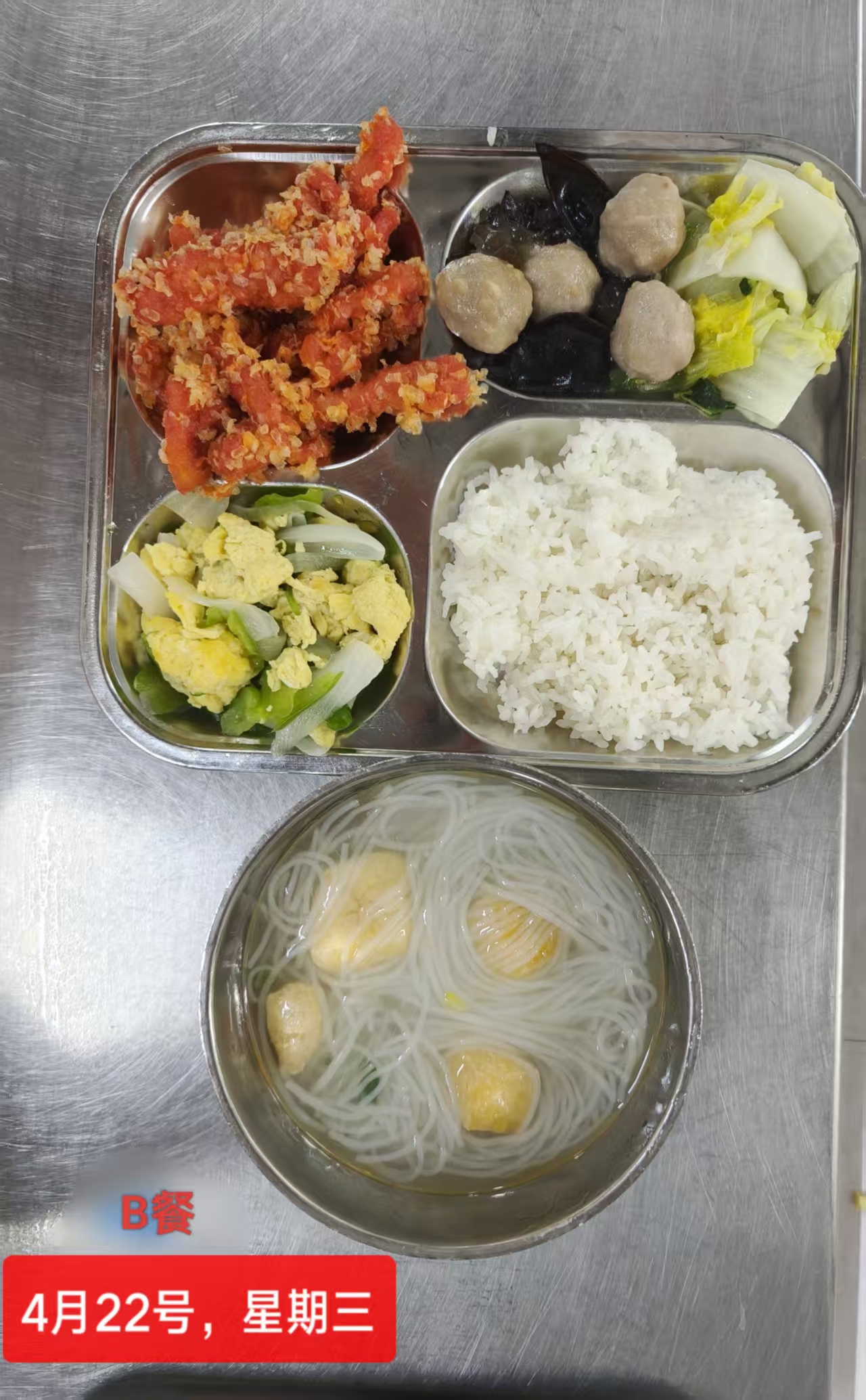| 22 | 三 | 雪花鸡柳 | 三鲜丸子 | 青椒洋葱炒蛋 | 娃娃菜 | 油豆腐粉丝汤 | |||