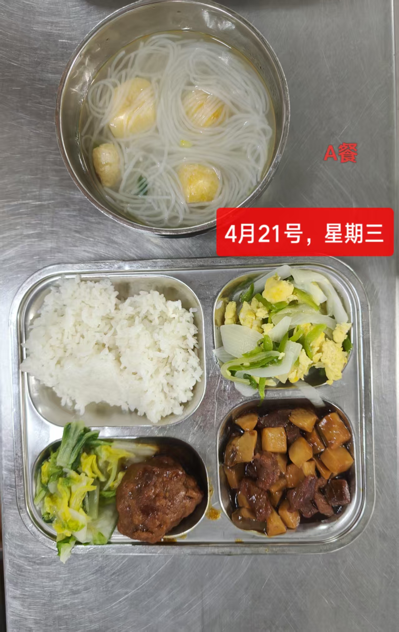 | 22 | 三 | 杏鲍菇牛肉粒 | 红烧肉圆 | 青椒洋葱炒蛋 | 娃娃菜 | 油豆腐粉丝汤 | |||