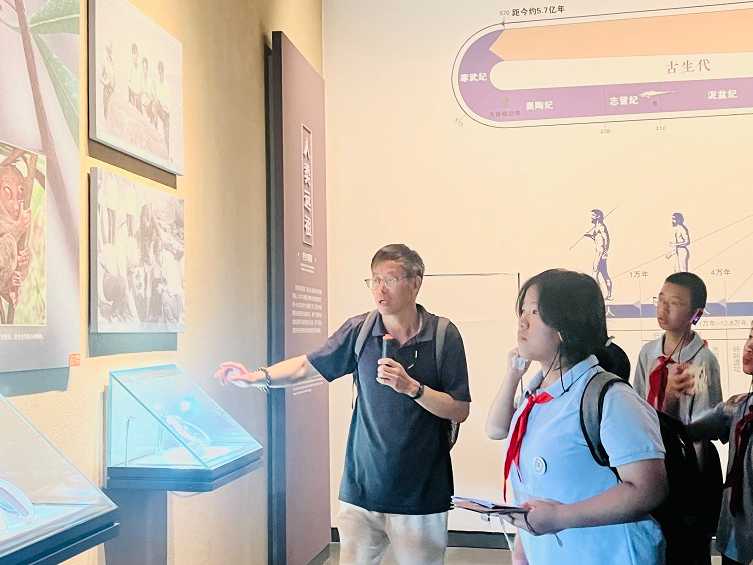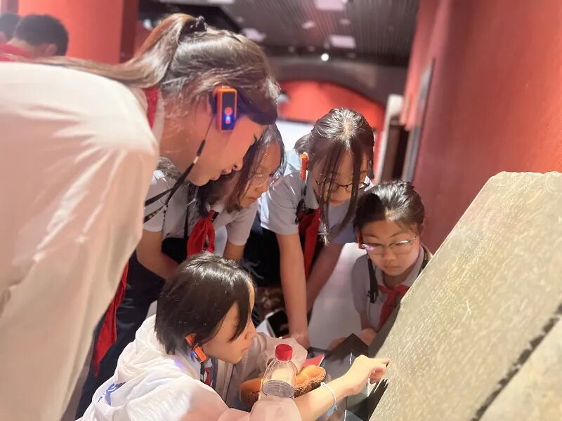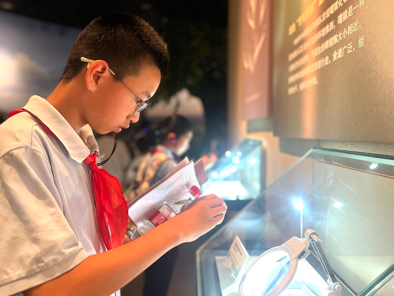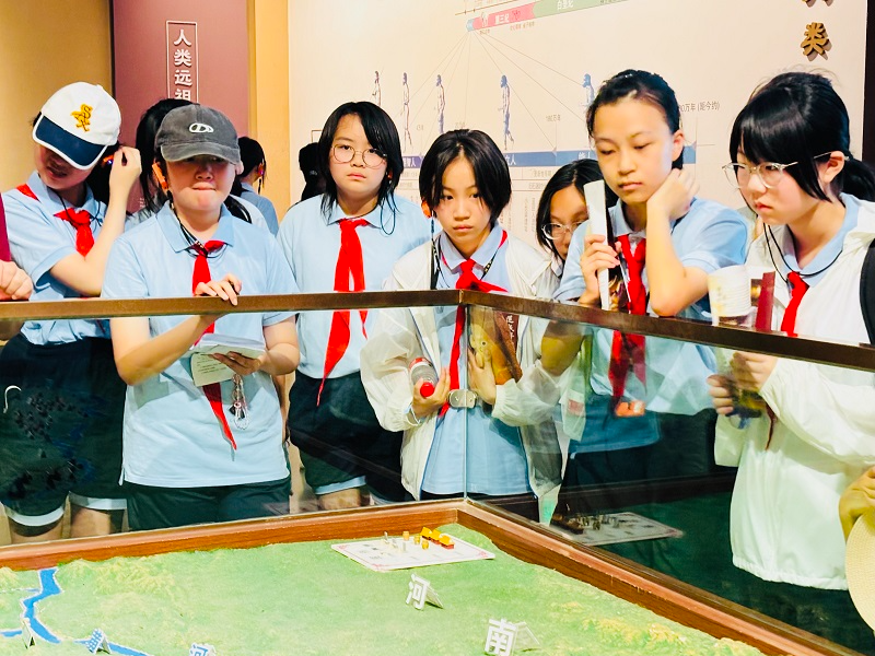 步入展厅,探索的脚步便循着文明脉络展开。面对世纪曙猿化石,同学们俯身贴近展柜细察纹路,学习实践手册上快速记录着“最早灵长类”的关键信息,举手追问“它与我们现在的人类有直接关系吗?”“先民们就是在这片土地上开始繁衍生息的吗?”在与讲解员的问答中,远古生命演化的轨迹逐渐清晰。