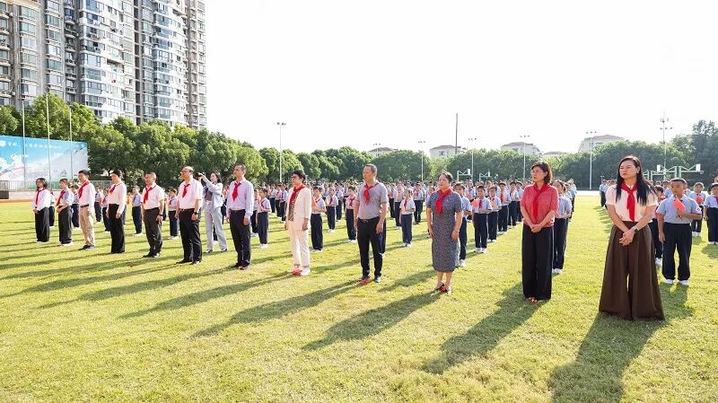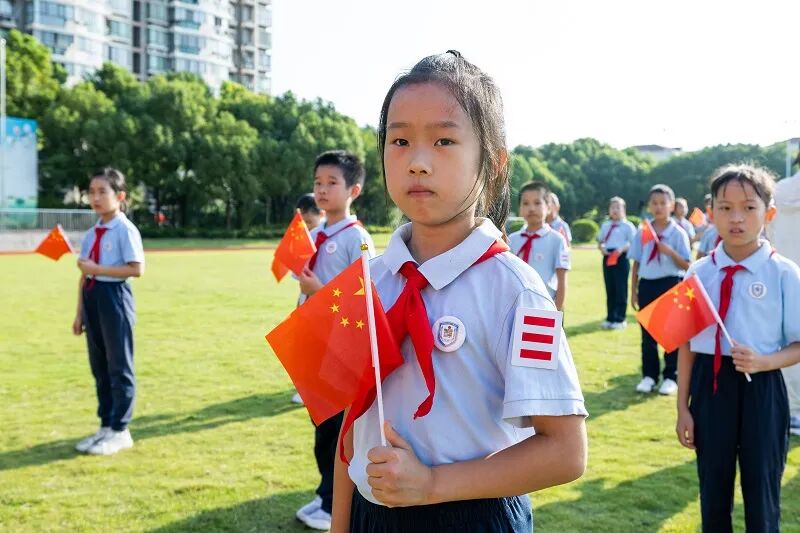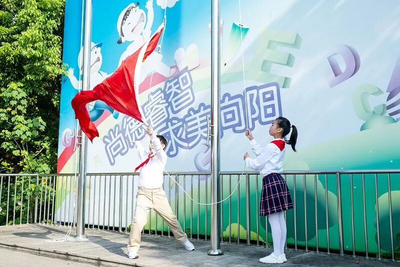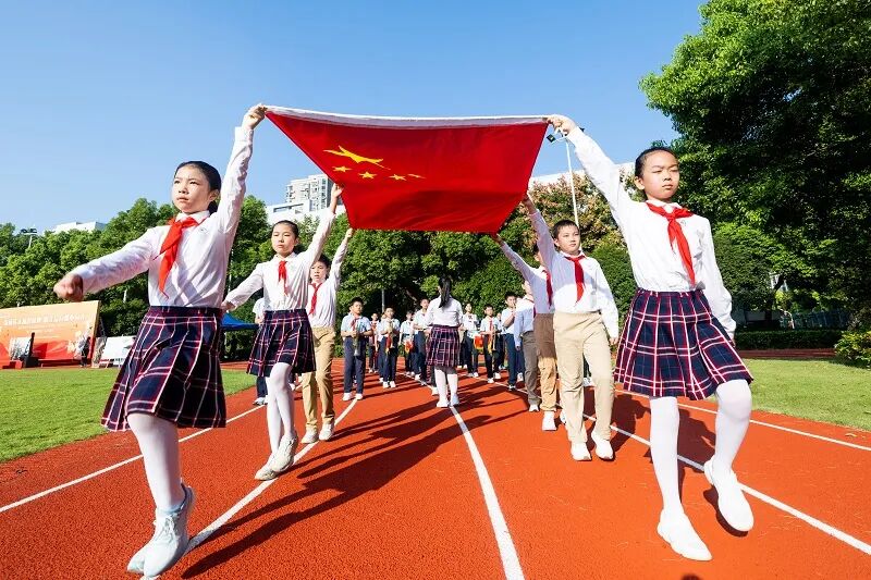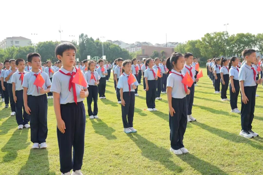 “少先队员要努力成长为有志向、爱学习、敢奋斗的好少年,共青团员更要以身作则,带动身边伙伴德智体美劳全面发展,朝着‘强国建设’的目标坚定前行。”接过历史的接力棒,更需明确当代青少年的责任与担当。活动中,共青团员和少先队员代表现场宣读了活动倡议书,表达了树立远大理想、担当时代使命的坚定决心。“五星红旗迎风飘扬,胜利歌声多么响亮。歌唱我们亲爱的祖国,从今走向繁荣富强……”全场师生挥动旗帜、舞动青春,齐声高唱《歌唱祖国》,熟悉的旋律、滚烫的歌词,将现场的爱国热情扎根心中。