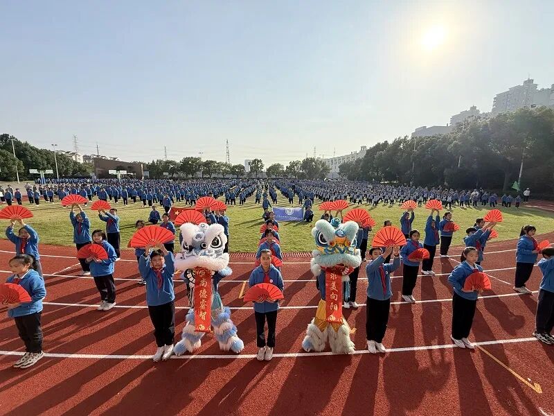 随着广播操的旋律响起,团体操展示环节随即登场,抬手、弯腰、踢腿、转身,每一个动作都规范标准、舒展有力,如同一幅流动的青春画卷。紧接着,武术操表演点燃全场激情,“哈!”“嘿!” 的呐喊声铿锵有力,将传统武术的刚劲与少年的活力完美融合。同学们眼神坚定、气势昂扬,既展现了中华武术的文化魅力,又传递出尚阳学子不畏挑战、奋勇向前的精神。