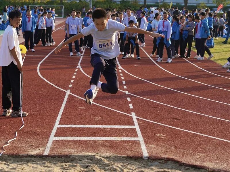 跳高与跳远赛场上,选手们不断挑战自我极限。助跑、起跳、腾空、落地,一系列动作流畅连贯,每一次成功跃过横杆,都迎来阵阵喝彩。4×100 米接力赛更是将竞技氛围推向高潮,接力棒的默契传递,是团队协作的最佳见证,运动员们配合无间,向着共同的目标奋勇争先,展现了尚阳学子的集体荣誉感。