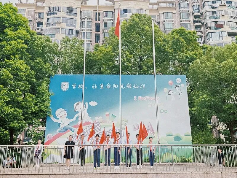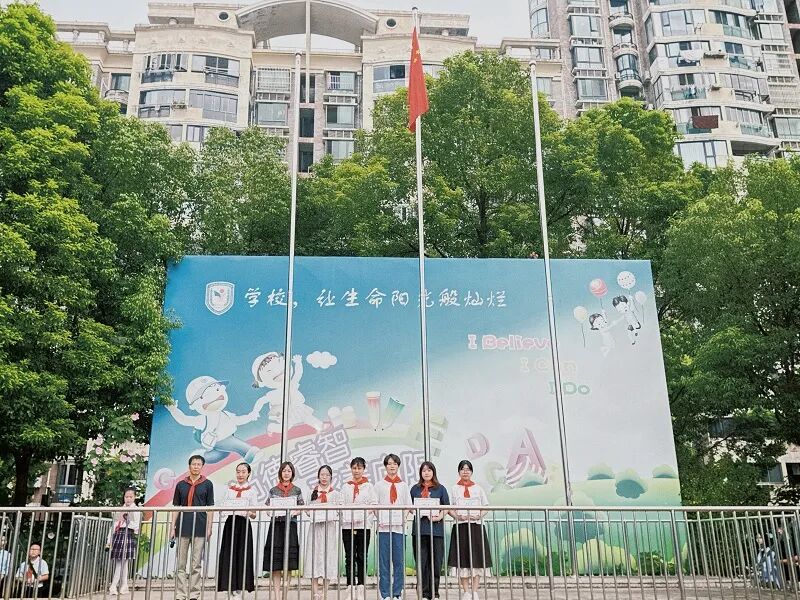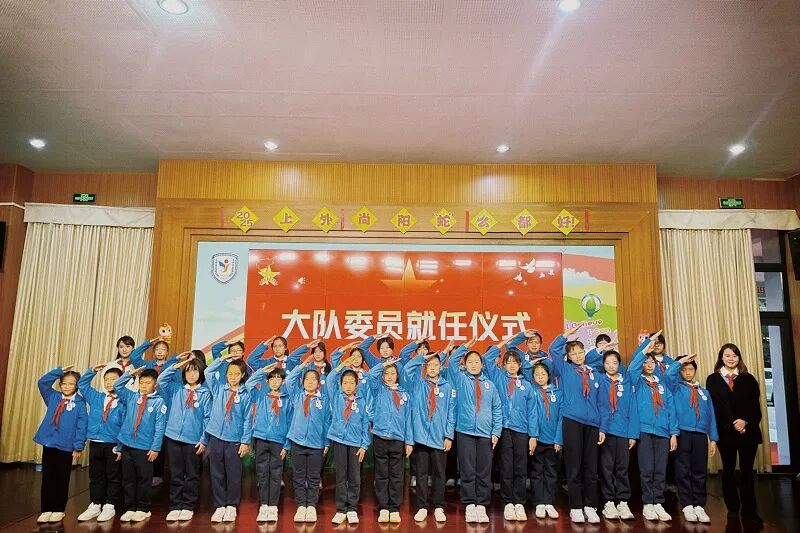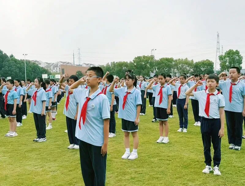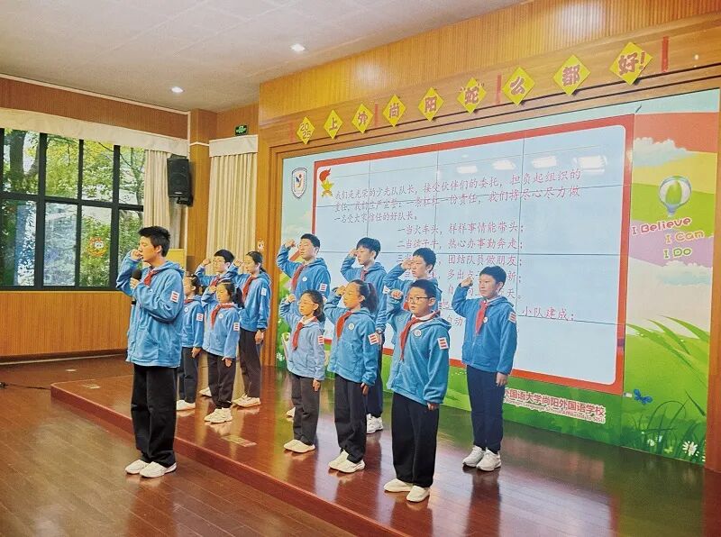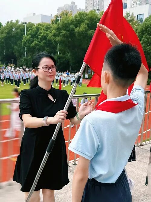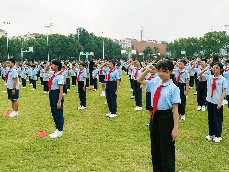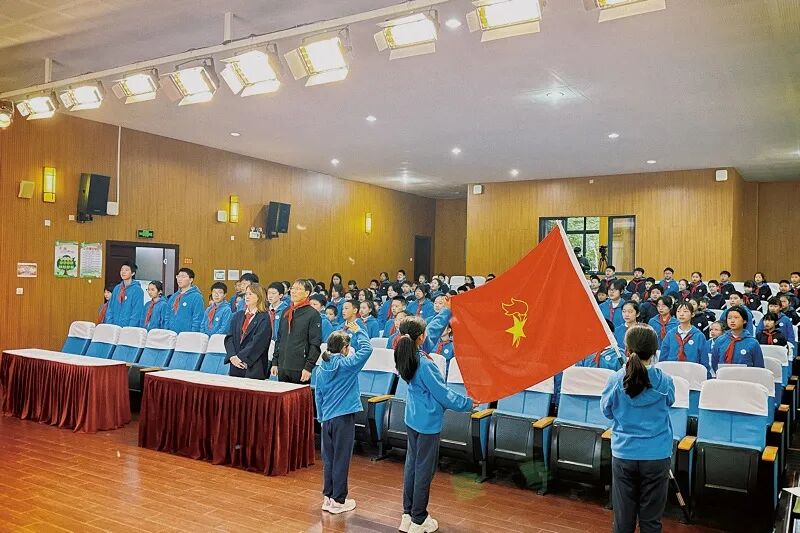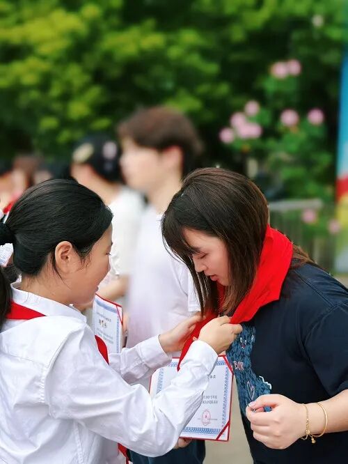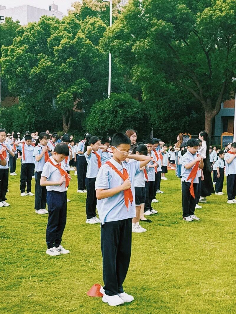 在大队委员的带领下,全体队员重温入队誓词,铮铮誓言回荡操场;校领导为新建中队授旗,辅导员接过聘书,少先队员为辅导员佩戴红领巾,一张张笑脸映着鲜艳的红,定格成“扣好人生第一粒扣子”的生动画面。