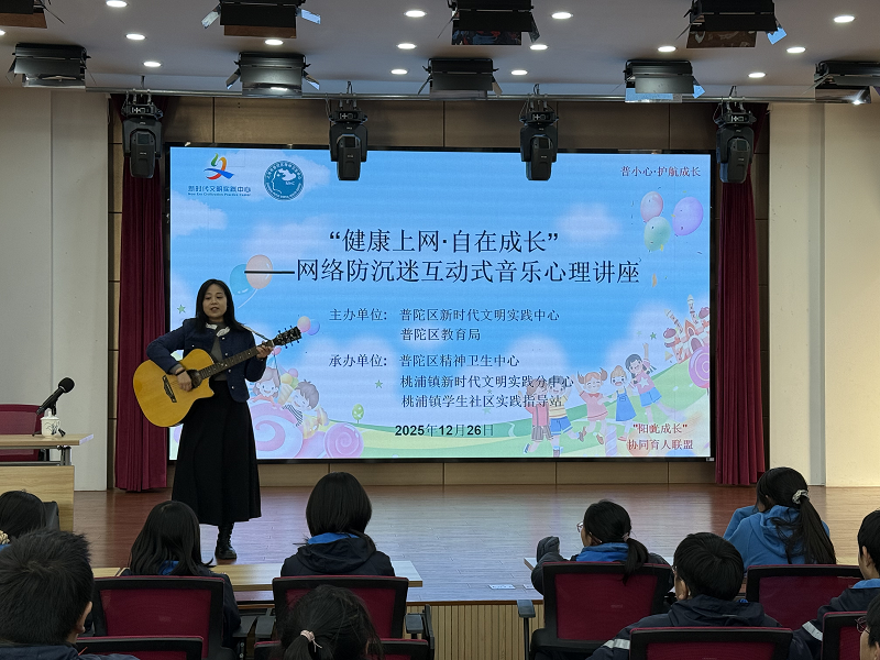 为引导青少年正确认识网络、合理使用网络,在虚拟与现实之间找到平衡,近日,我校在普陀区桃浦镇文明办的支持下,特邀普陀区精神卫生中心的张戎文老师,举办了一场主题为“健康上网・自在成长”的网络防沉迷互动式音乐心理讲座,七年级同学们在音乐与互动中开启了一段特别的心灵成长之旅。