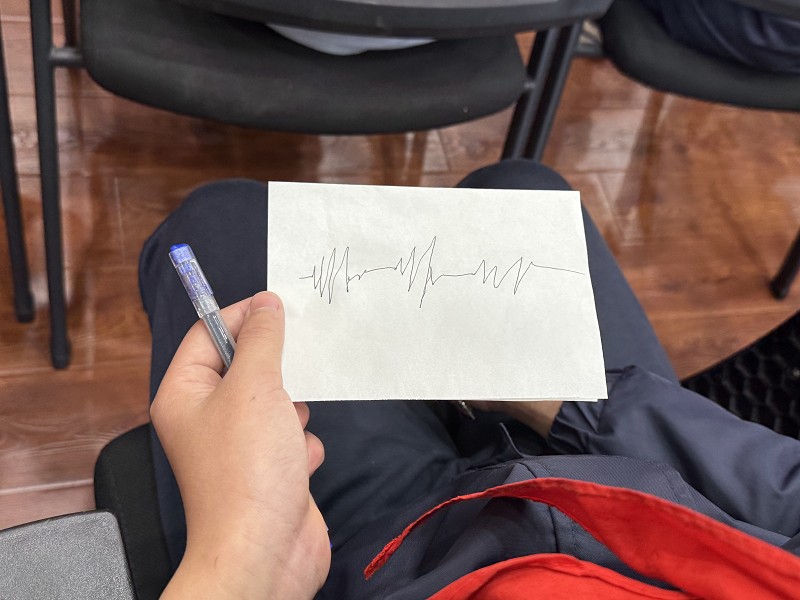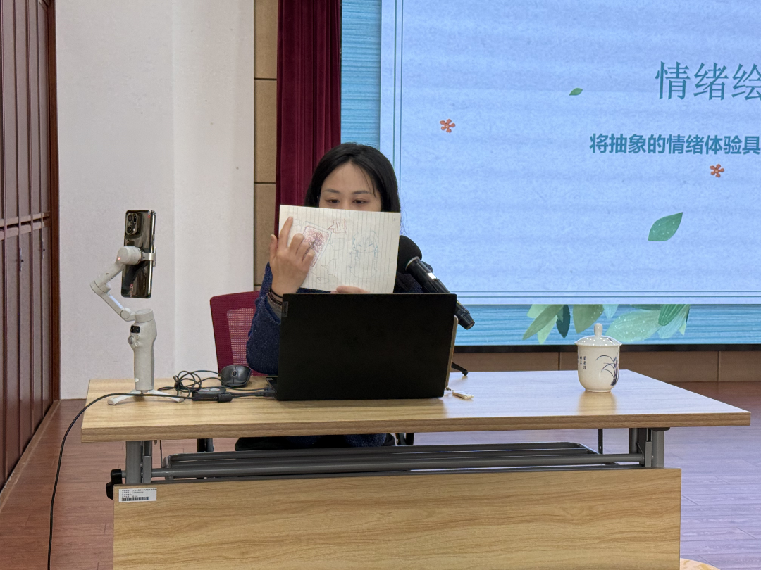 讲座核心环节围绕情绪绘画与歌曲创作两大互动形式展开。在情绪绘画环节,张老师播放两段不同情境的音乐,引导同学们用颜色、线条和形状外化内心感受:一是长时间刷手机、刷视频后的感受,二是完成最喜欢的事情后的心情。同学们纷纷提笔创作,有的用灰暗的色调和杂乱的线条描绘出网络沉迷后的疲惫与难受,有的则用明亮的色彩和流畅的笔触展现出收获成就感时的愉悦与充实。一幅幅作品成为同学们情绪的“具象化镜子”,让大家直观感受到网络世界与现实生活带来的不同心灵体验。