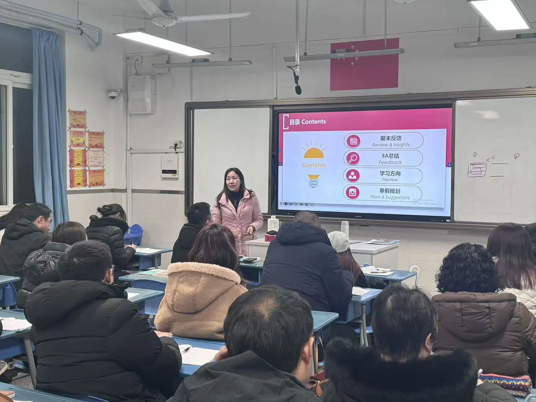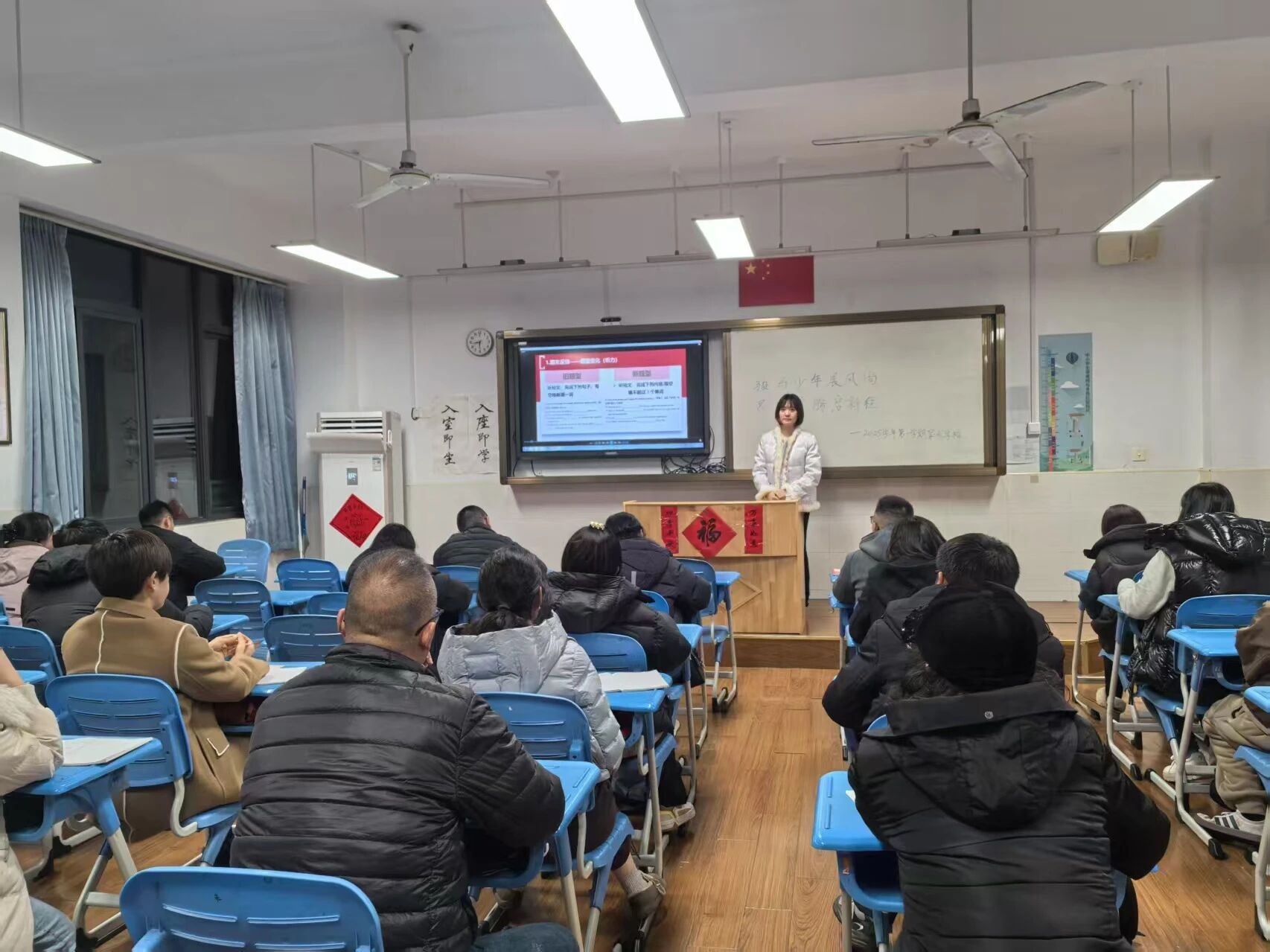 随后,由班主任组织开展班级交流活动。各班主任反馈了学生在年级与班级层面的行规表现,表扬了学生的优势之处,也给学生的寒假生活指明了方向。学科教师重点沟通了学科的重难点,以及学科学习的方法。